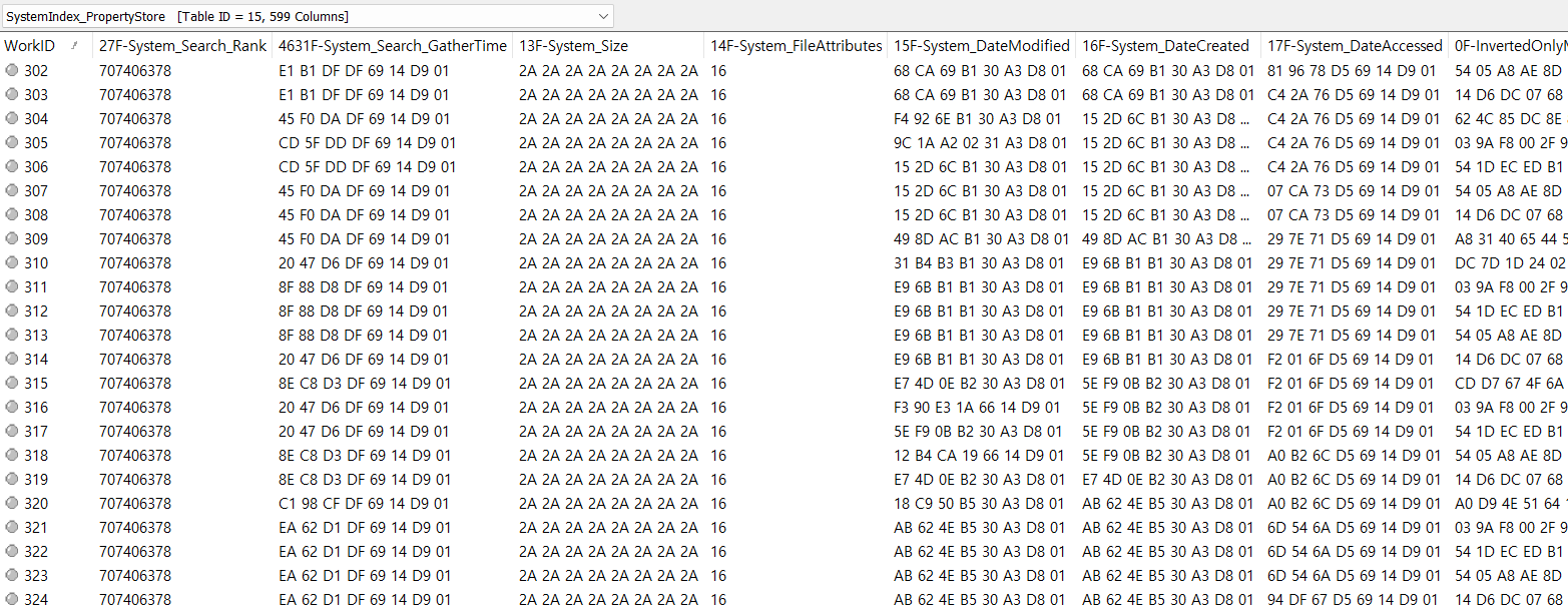 파일, 문서, 이메일 등 "내용"과 "속성 정보"가 가장 많이 저장된 테이블로 Windows Search 인덱싱의 메타데이터 창고 역할을 한다.