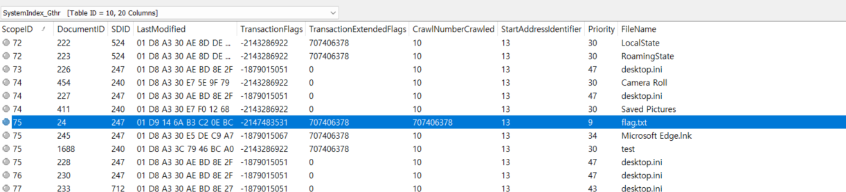 즉, 사용자가 최근 어떤 파일을 열었는지! 특정 시점에 파일이 존재했는지! 인덱싱 실패한 파일 기록 등이 존재하기 때문에 아주 중요한 테이블이다!!