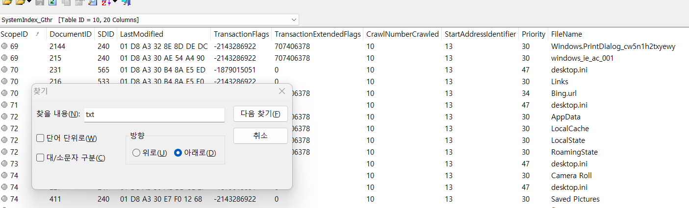 크롤링(Log 수집) 기록 테이블로서 Wiindows Search가 어떤 경로를 언제 인덱싱했는지 로그 형태로 저장된다.